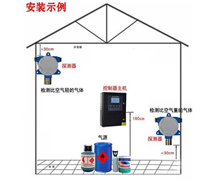 10、對于檢測可燃氣體比重大于空氣的諸如烷烴類(甲烷沼氣、民用煤氣除外)、烯烴類(乙烯除外),液化石油氣、汽油、煤油時,請將探測器安裝在低于泄漏點的下方平面上,距地面不得高于30cm。并請注意周圍的環(huán)境特點,例如室內通風不流暢部位,地槽地溝容易積聚可燃氣體的地方,現(xiàn)場通往控制室的地下電纜溝,有密封蓋板的污水溝槽等,都是經常性的或在生產不正常情況下容易積聚可燃氣的場所,對于這些環(huán)境都是不可忽視的安全監(jiān)測點。